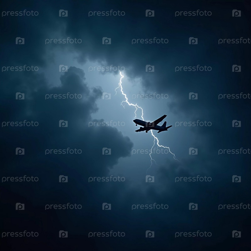 Самолет попадает в сильную грозу, окруженный темными облаками и освещенный яркими ударами молний, подчеркивающими опасность в небе. Причины авиакатастроф. Генеративный ИИ