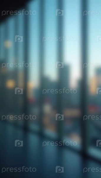 Размытая перспектива демонстрирует современный городской горизонт через стеклянную стену в сумерках, раскрывая яркость и сложность городской жизни. Угасающий свет отражает городскую энергию. Генеративный ИИ