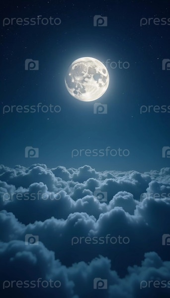 Светящаяся луна висит в темном небе, окруженная мягкими облаками, которые создают мечтательную атмосферу. Сцена приглашает к тихим моментам размышлений и удивления под звездами. Генеративный ИИ