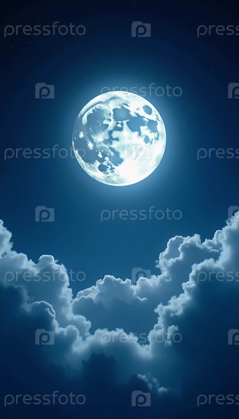 Светящаяся луна висит в темном небе, окруженная мягкими облаками, которые создают мечтательную атмосферу. Сцена приглашает к тихим моментам размышлений и удивления под звездами. Генеративный ИИ