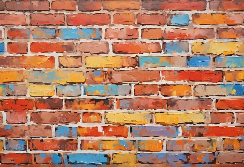 Текстурированная кирпичная стена демонстрирует множество цветов, включая теплые красные, оранжевые и холодные синие оттенки, что добавляет яркости и глубины современному пространству. Генеративный ИИ