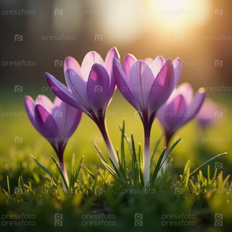 Нежные розовые цветы крокуса расцветают на сочной зеленой траве, солнечный свет в спокойной весенней обстановке. Возрождение природы. Шафранный крокус род многолетних луковичных травчатых растений семейства Ирисовых. AI