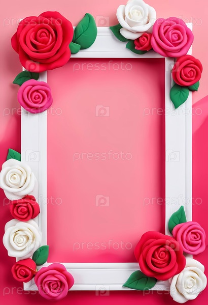 Яркая рамка, украшенная красными, розовыми и белыми розами, расположена на нежно-розовом фоне, предоставляя идеальное место для личных сообщений или дорогих сердцу воспоминаний. Генеративный ИИ