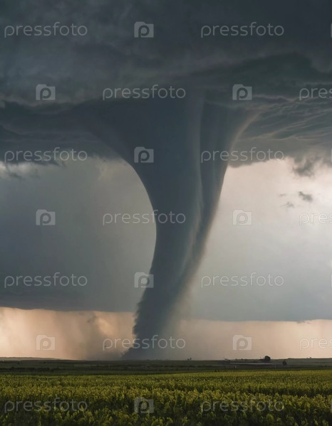 Мощный торнадо спускается из темных облаков, интенсивно закручиваясь посреди спокойного сельского поля. Заходящее солнце отбрасывает теплый свет, усиливая драматическую атмосферу. Генеративный ИИ