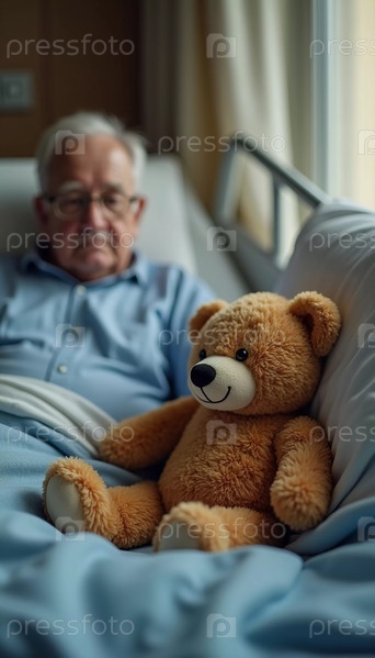 Пожилой мужчина отдыхает на больничной койке, задумчиво глядя на мягкого плюшевого мишку рядом с собой. Теплое присутствие мягкой игрушки приносит комфорт и товарищество во время его выздоровления