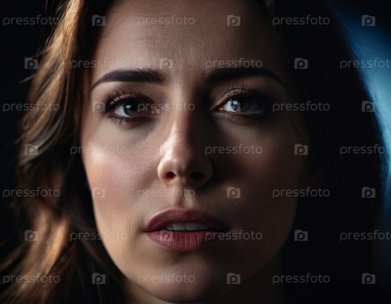 Женщина с нахмуренными бровями и обеспокоенным выражением лица смотрит прямо в камеру. Освещение тусклое, отбрасывает тени вокруг лица, подчеркивая ее стресс. Страх, разочарование, расстройство, беспокойство и задумчивость. ИИ