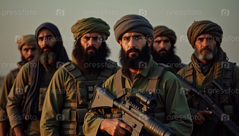 Группа вооруженных мужчин, одетых в традиционную одежду, стоит сплоченно, демонстрируя товарищество и готовность. Воинствующие мусульмане, похожие на Талибан или пакистанскую армию. Густая борода. Генеративный ИИ