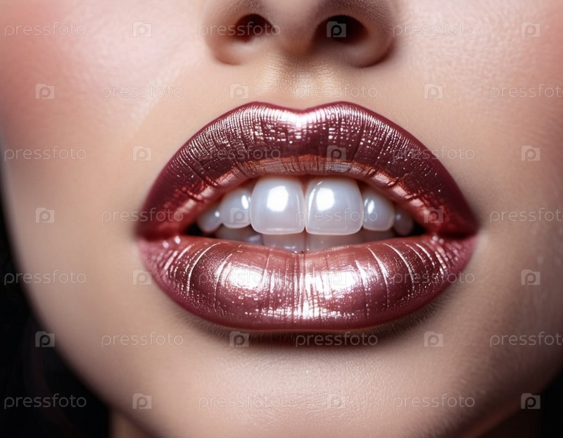 Большой план женских губ со сверкающей жемчужной помадой. Легкий блеск. Губы слегка приоткрыты, открывая вид на белые зубы. Чувствительность и сексуальность. Жемчужная помада. AI