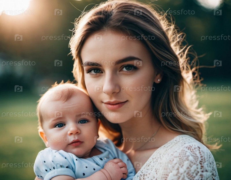 Мать с любовью смотрит на своего младенца, держа его на руках. Милый младенец спокоен. Любовь матери и ребенка. Счастливое детство. Семейные отношения, материнство и плодовитость