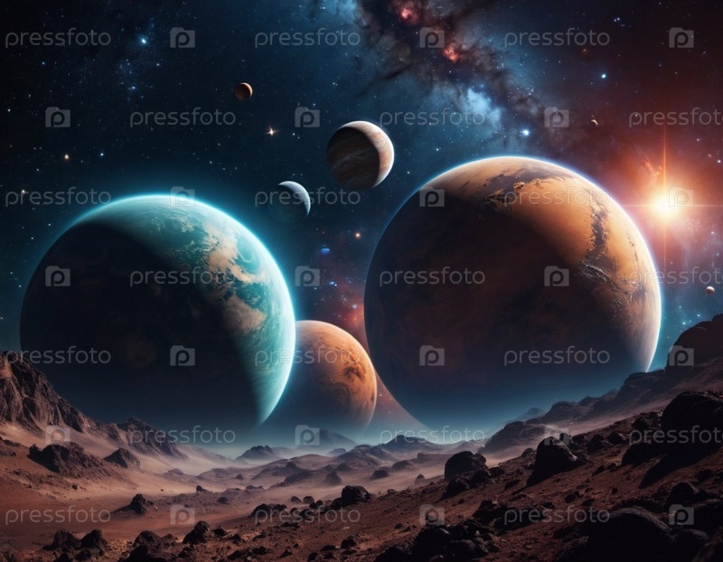 Планетарная система с несколькими планетами, большим ярко окрашенным газовым гигантом и каменистой планетой. Яркие звезды и огромное пространство темного космоса с галактикой на заднем плане. Космические просторы. Космонавтика. ИИ