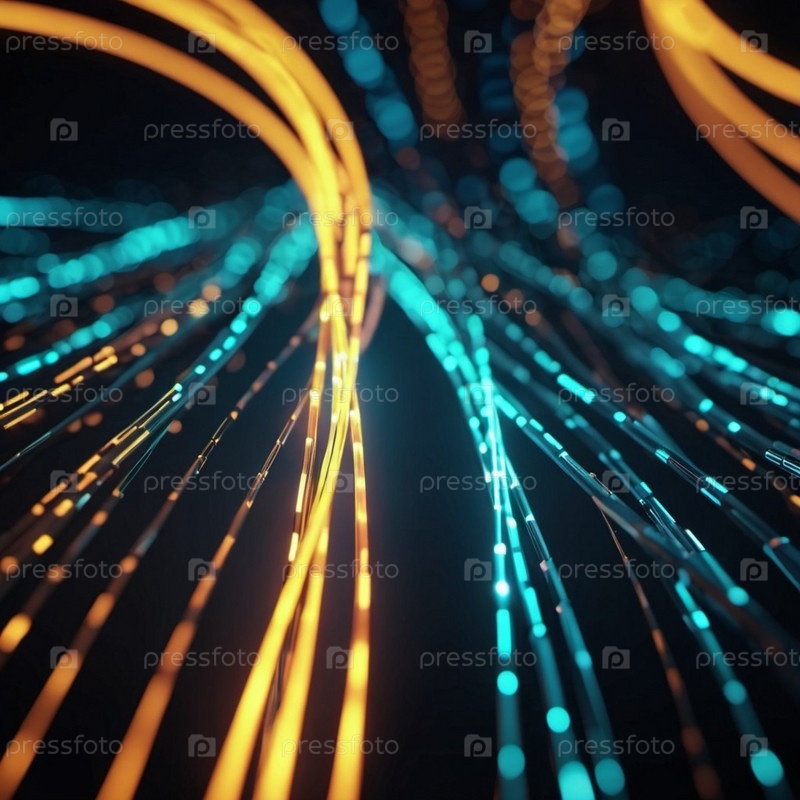 Синие и оранжевые светящиеся провода скручиваются и переплетаются на темном фоне с боке-огнями. Черные кабели и разъемы со светящимися огнями и цепями соединяются, образуя сеть. Создано с помощью ИИ