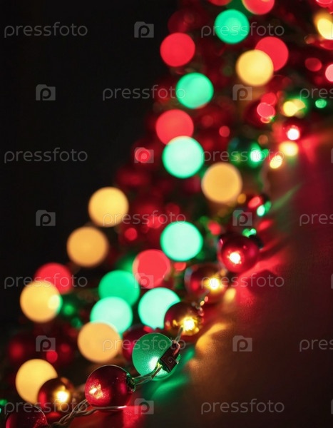 Рождественские огни на темной поверхности. Огни смешивают красный, зеленый, желтый и синий цвета. Огни нанизаны витым образом, создавая ощущение движения и причудливости. Праздничная и привлекательная атмосфера. Рождественский дизайн