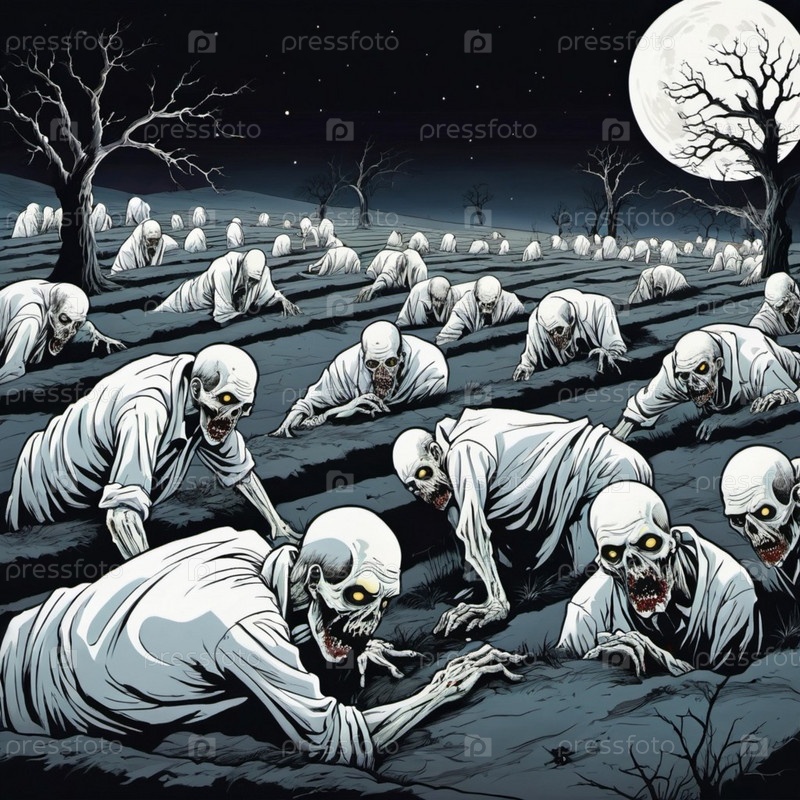 Ужасные комичные зомби появляются из могил, разложившиеся тела освещаются лунным светом. Скелетные фигуры бродят среди надгробий, в то время как другие ползают по земле, демонстрируя свой ужасный вид. ИИ