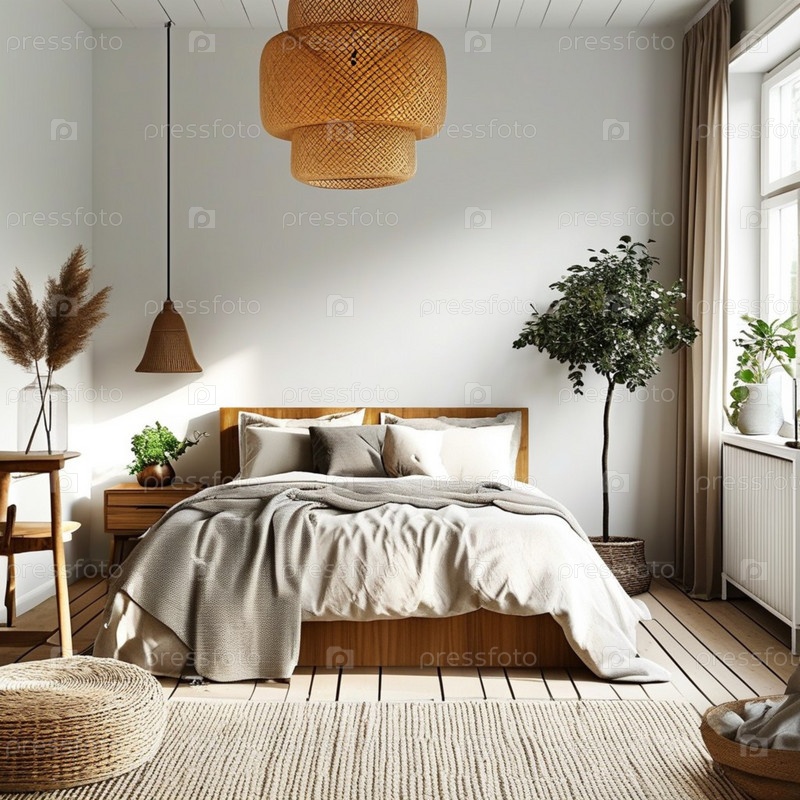 В этой скандинавской спальне установлена удобная кровать с многослойным постельным бельем, стильные растения и минималистский декор, создающий атмосферу умиротворения