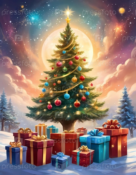 Декорированная рождественская елка, украшенная красочными игрушками и сложенными подарками, готова к празднованию в уютной праздничной обстановке. упакованные подарки разных цветов. Праздничная атмосфера, теплота и радость. AI