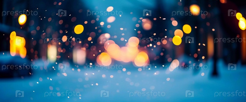 Зима приносит мягкий снегопад на городские улицы, где разноцветные огни висят над головой, создавая теплую и праздничную атмосферу. Эффект боке от огней добавляет причудливый штрих, подчеркивая радость сезона
