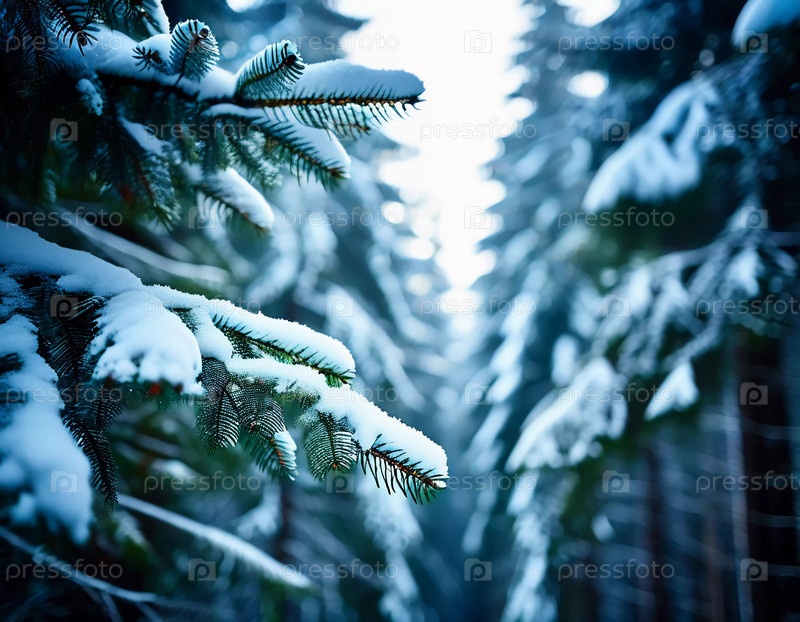 Безмятежный еловый лес, покрытый зимним снегом, демонстрирующий покрытые инеем деревья и мягкий снегопад, создающий спокойную атмосферу в мирной лесной обстановке. Генеративный ИИ