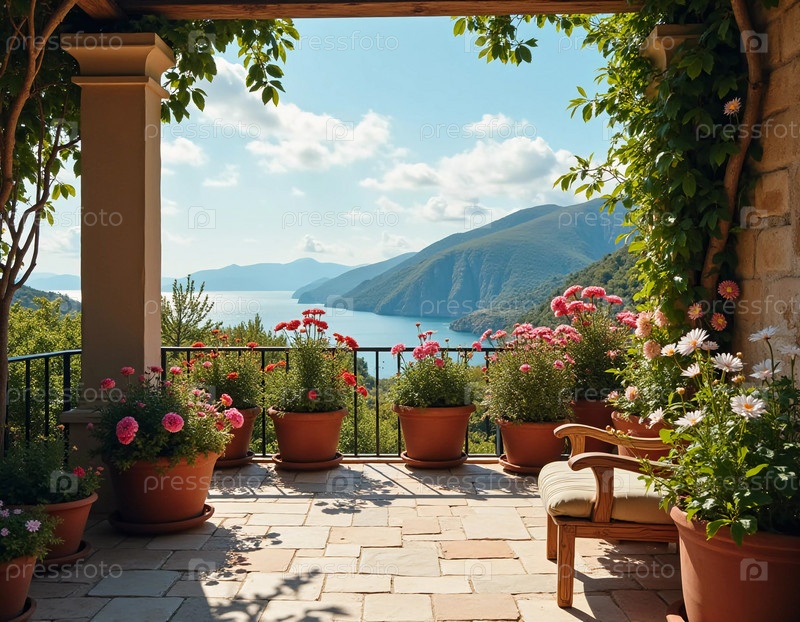 Солнечная терраса, окруженная яркими цветами, располагает к отдыху, предлагая захватывающий вид и уютное место со столиками и стульями. Терраса украшена цветущими цветами и живописными горами. Генеративный ИИ