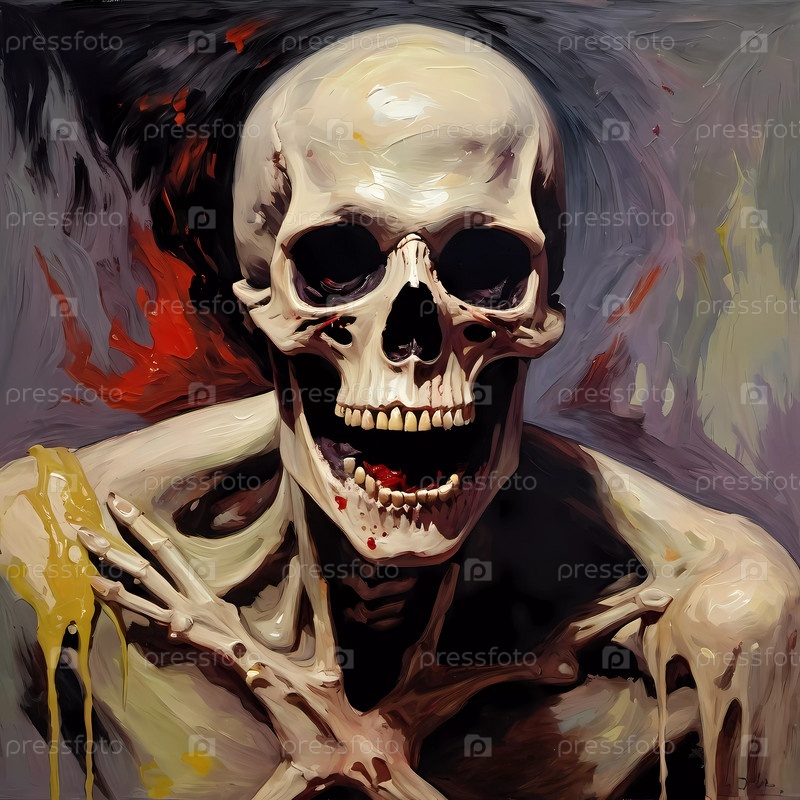 Пробуждение зловещего в темной, жуткой обстановке, демонстрирующей подробный и выразительный человеческий скелет, который вызывает чувство таинственности и предчувствия. Генеративный ИИ