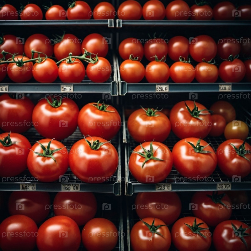Супермаркет заполнен красными томатами. Томаты сложены гроздьями. Свет отражается от поверхности томатов, подчеркивая яркий цвет и блестящую текстуру. Они были недавно собраны. Генерация ИИ