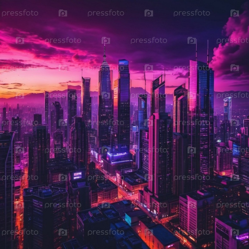 Захватывающий закат бросает теплый отблеск на возвышающиеся небоскребы в оживленном мегаполисе, создавая потрясающий контраст с красочным небом. Энергичная атмосфера городской жизни. Генеративный ИИ