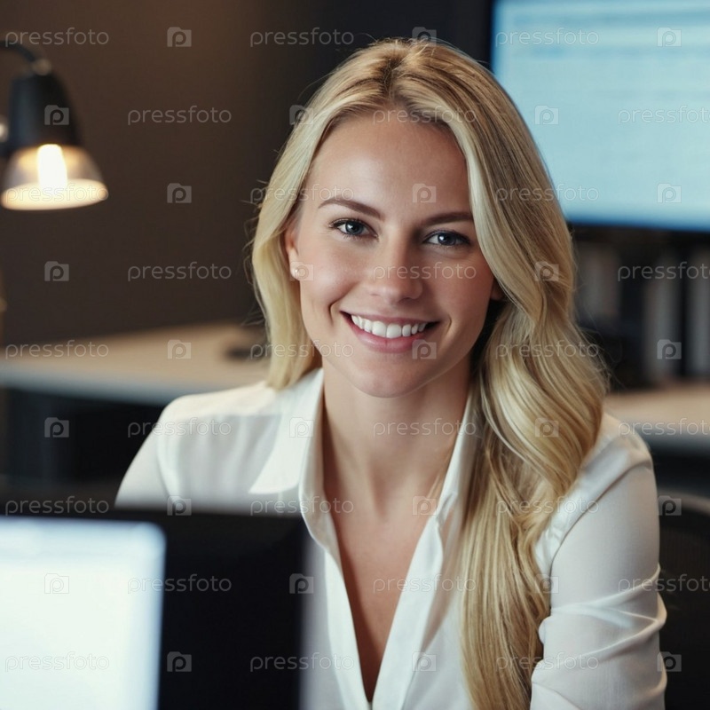 Профессиональная блондинка в белой рубашке сидит за своим столом в современном офисе, излучая уверенность и позитив. Окружающая среда усиливает ее доступное поведение. Генеративный ИИ