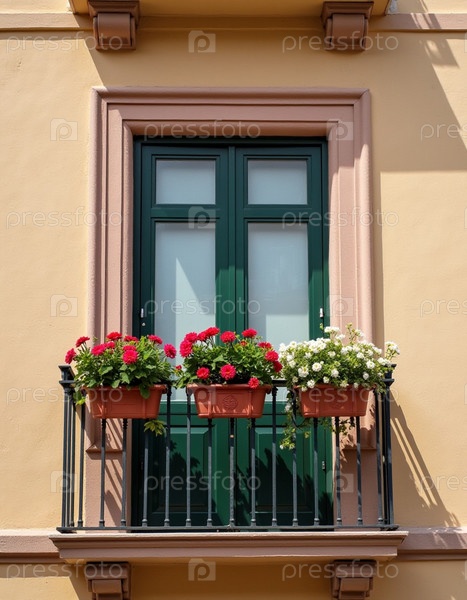 Типичный французский или итальянский балкон с цветочными горшками, вид снизу улицы. Солнечная терраса, окруженная яркими цветами, располагает к отдыху, предлагая уютное место со столом и стульями. Генеративный ИИ