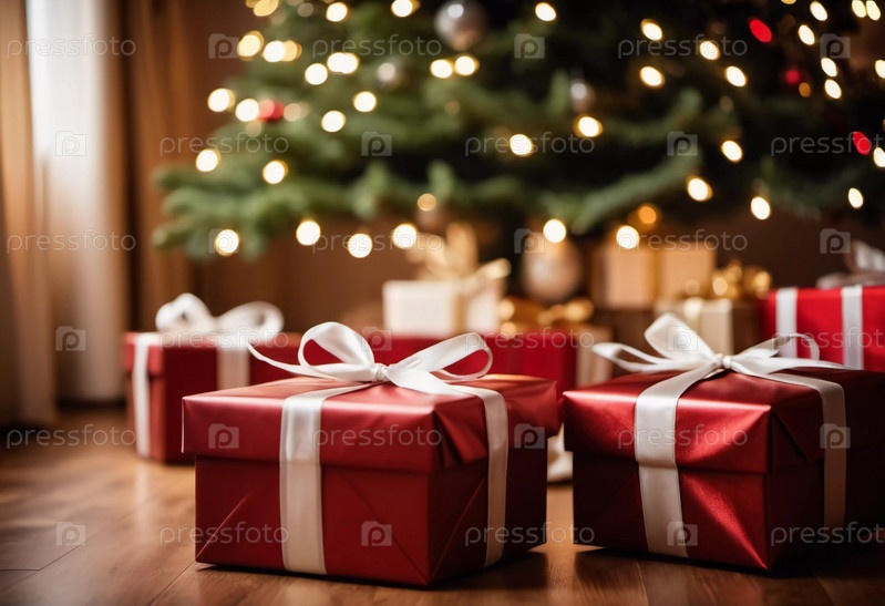 Уютная гостиная, украшенная праздничной рождественской елкой, украшенной сверкающими огнями и красочными безделушками, окруженная множеством тщательно упакованных подарочных коробок, ожидающих открытия. Искусство ИИ