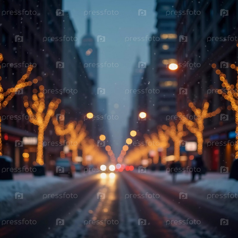 Тихий зимний вечер окутывает городскую улицу, где мягко падающий снег усиливает свечение рождественских огней. Праздничная атмосфера привлекает людей, празднующих Новый год. Генеративный ИИ