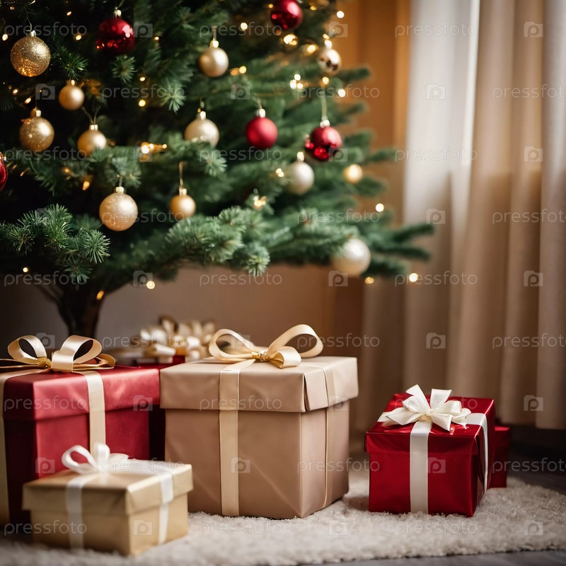 Упакованные в разноцветную упаковку подарки лежат под наряженной елью, украшенной сверкающими рождественскими игрушками, создавая веселую и праздничную атмосферу празднования Нового года