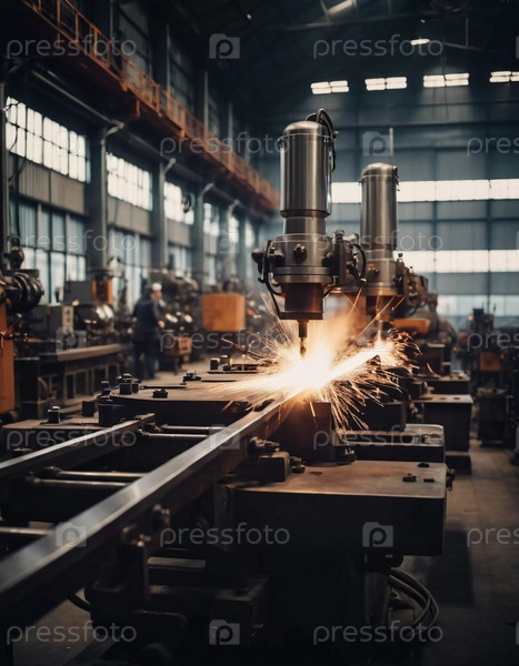 Производственное литейное предприятие, заполненное фрезерными станками, активно производит компоненты. Окружающая среда промышленная, характеризуется наличием инструментов машин, видимыми искрами, что предполагает точную работу. ИИ