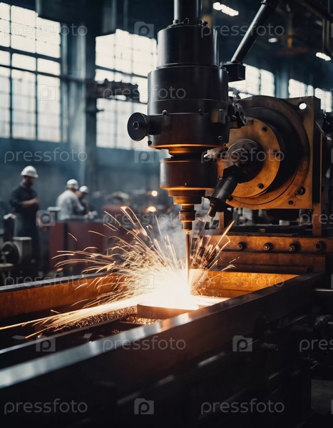 Производственное литейное предприятие, заполненное фрезерными станками, активно производит компоненты. Окружающая среда промышленная, характеризуется наличием инструментов машин, видимыми искрами, что предполагает точную работу. ИИ