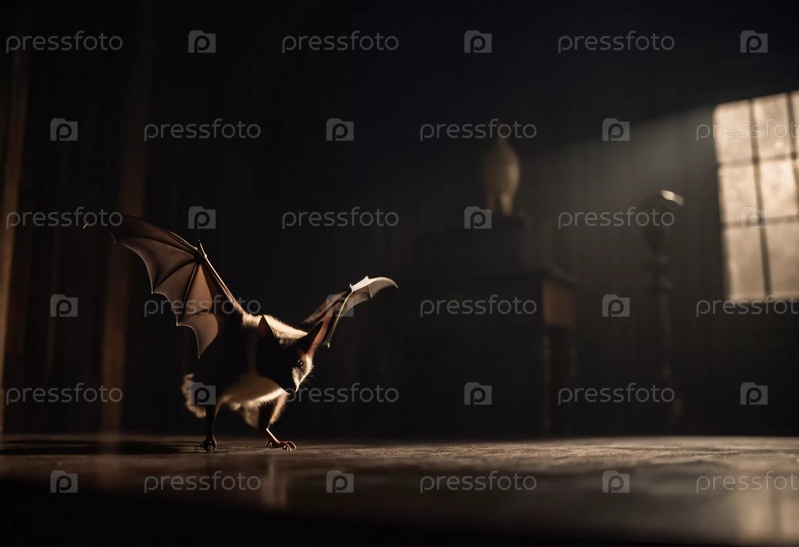 Летучая мышь, движется по темному коридору, наполненному теплым оранжевым светом. Атмосфера создает жуткую и напряженную атмосферу, усиливая таинственную атмосферу. Генеративный ИИ