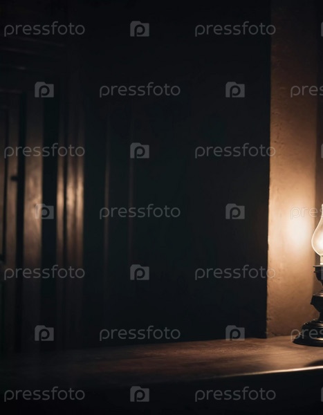 Мерцающая лампа освещает темную комнату, наполненную глубокими тенями, что создает ощущение леденящего присутствия и тревожной атмосферы, витающей в воздухе. Генеративный ИИ