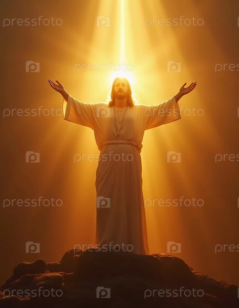 Фигура, представляющая Христа, стоит на скалистом возвышении, протянув руки к небесам, освещенная ярким лучом света, символизирующим воскресение и божественность. Генеративный ИИ