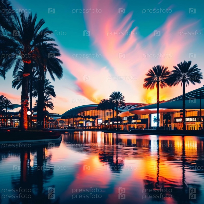 На закате яркие цвета отражаются от воды около современного торгового центра, окруженного пальмами, создавая живописную и спокойную обстановку для посетителей. Генеративный ИИ