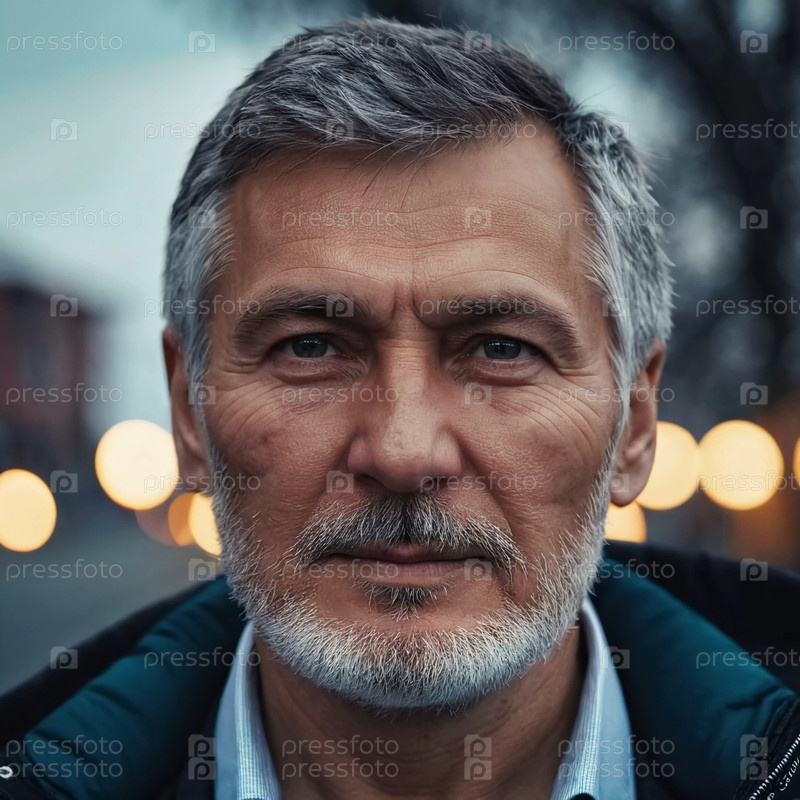 Мужчина средних лет с седыми волосами и карими глазами смотрит прямо на зрителя, демонстрируя признаки мудрости и опыта. Житель России, волевой мужчина 45-50 лет. Генеративный ИИ