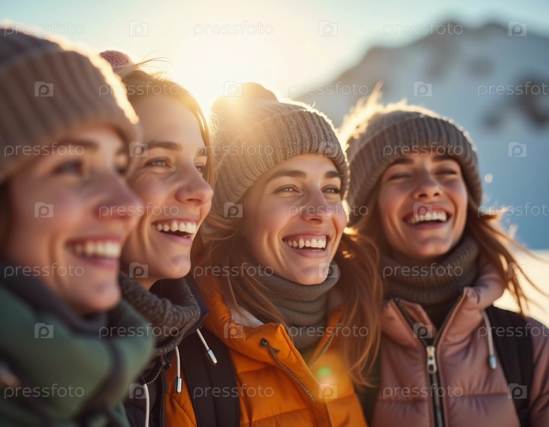 Молодые друзья собираются в зимней стране чудес, разделяя радостные моменты и смех под ярким солнцем. Они щеголяют в уютной зимней одежде, подчеркивая свое веселое приключение. Генеративный ИИ
