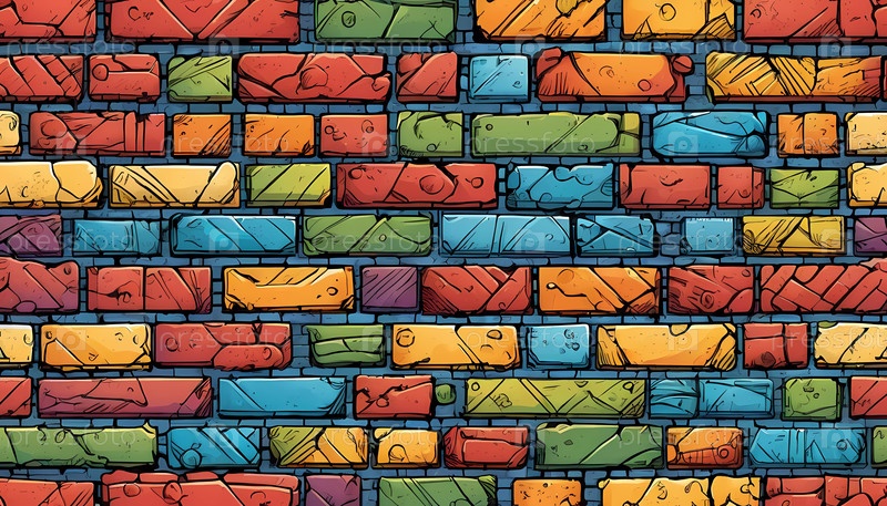 Эта яркая кирпичная стена демонстрирует множество цветов, включая красный, желтый, бирюзовый и фиолетовый. Дизайн отражает художественный подход, часто встречающийся в городской среде. Генеративный ИИ