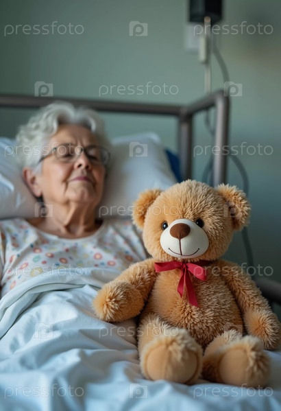 В тихой больничной палате пожилая женщина мирно отдыхает в постели, ее седые волосы мягко обрамлены