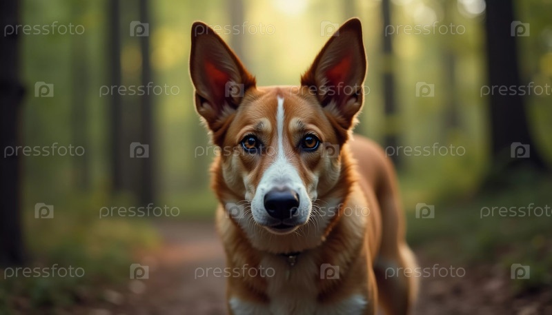 Энергичная собака исследует пышный лес, солнечный свет проникает сквозь деревья. Ее любопытные глаза отражают яркую зеленью вокруг, олицетворяя дикий дух приключений AI