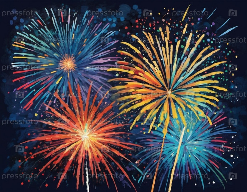 Яркое представление фейерверков освещает ночное небо. Большие вспышки света освещают темный холст выше, создавая завораживающее зрелище цвета и движения. Сгенерировано ИИ. Праздничный фон