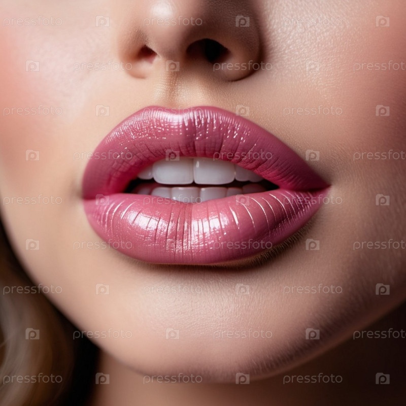 Крупный план женских губ с мерцающей розовой помадой, которая добавляет немного блеска. Губы слегка приоткрыты, открывая вид на белые зубы. Чувственность и сексуальность. Создано с помощью ИИ