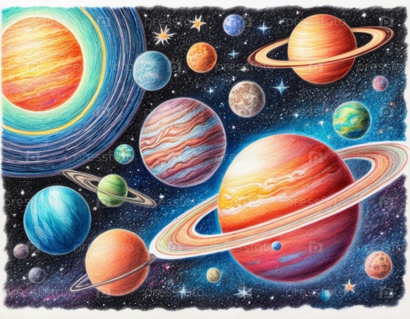 Планетарная система с несколькими планетами, большим ярко окрашенным газовым гигантом и каменистой планетой. Яркие звезды и огромное пространство темного космоса с галактикой на заднем плане. Космические просторы. Космонавтика. ИИ