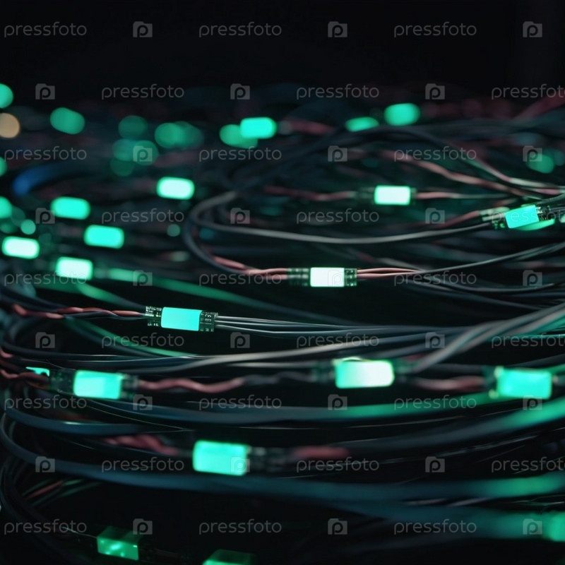 Синие и оранжевые светящиеся провода скручиваются и переплетаются на темном фоне с боке-огнями. Черные кабели и разъемы со светящимися огнями и цепями соединяются, образуя сеть. Создано с помощью ИИ