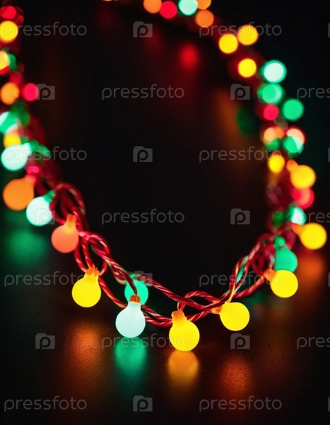 Рождественские огни на темной поверхности. Огни смешивают красный, зеленый, желтый и синий цвета. Огни нанизаны витым образом, создавая ощущение движения и причудливости. Праздничная и привлекательная атмосфера. Рождественский дизайн
