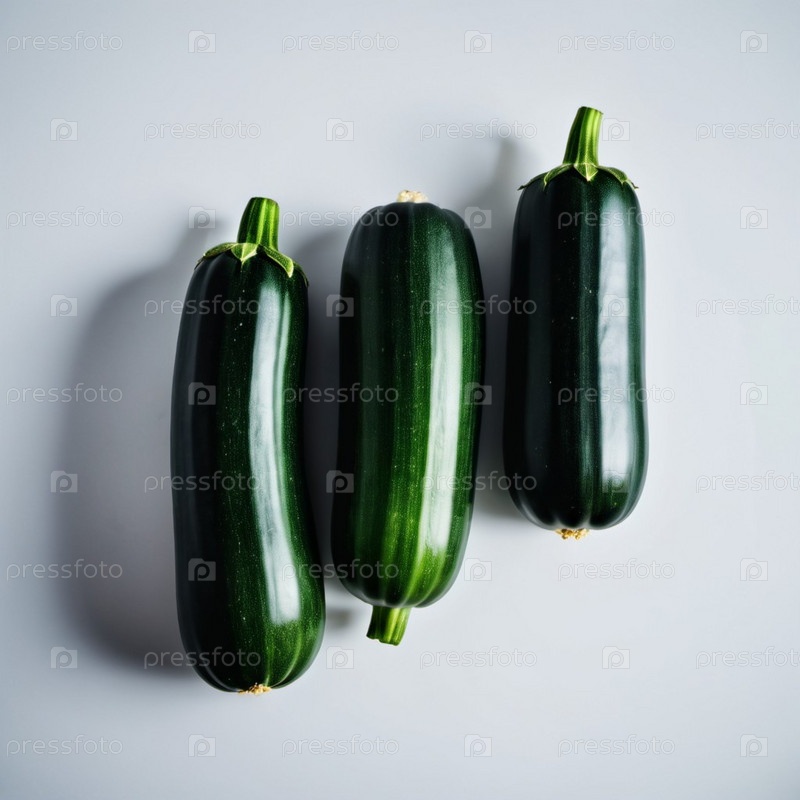 Овощи цуккини, ярко-зеленого оттенка, расположены на нетронутой белой поверхности. Цукини располагаются в разных ориентациях, демонстрируя свою удлиненную цилиндрическую форму, гладкие плотные текстуры