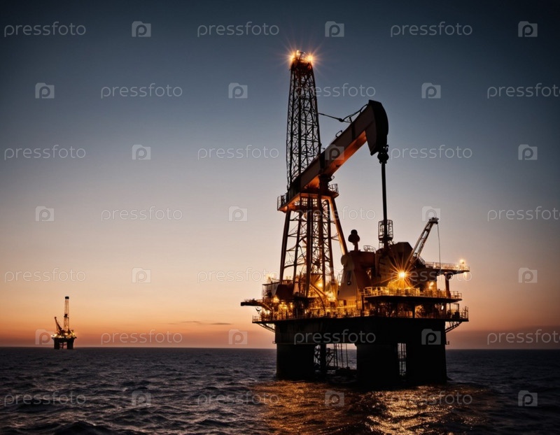 Большая, освещенная морская нефтяная вышка возвышается над водой в сумерках.Огни башни отбрасывают теплый свет на затемняющееся небо, а силуэт платформы обрамлен краем воды