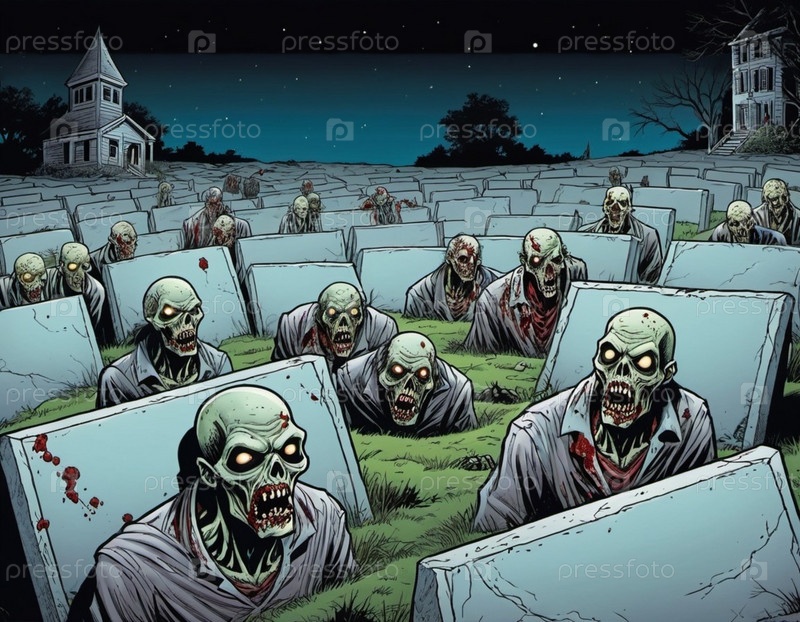 Ужасные комичные зомби появляются из могил, разложившиеся тела освещаются лунным светом. Скелетные фигуры бродят среди надгробий, в то время как другие ползают по земле, демонстрируя свой ужасный вид. ИИ