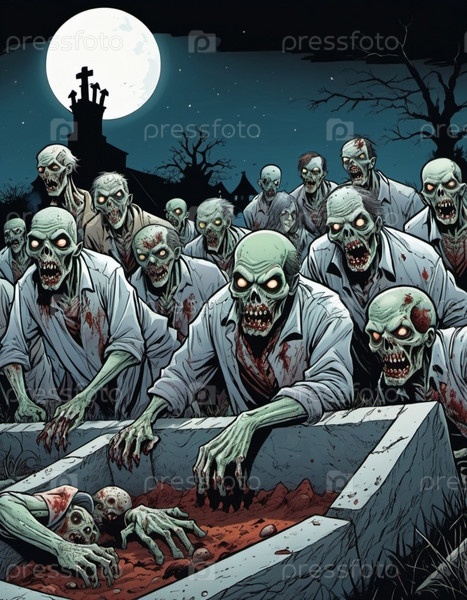 Ужасные комичные зомби появляются из могил, разложившиеся тела освещаются лунным светом. Скелетные фигуры бродят среди надгробий, в то время как другие ползают по земле, демонстрируя свой ужасный вид. ИИ